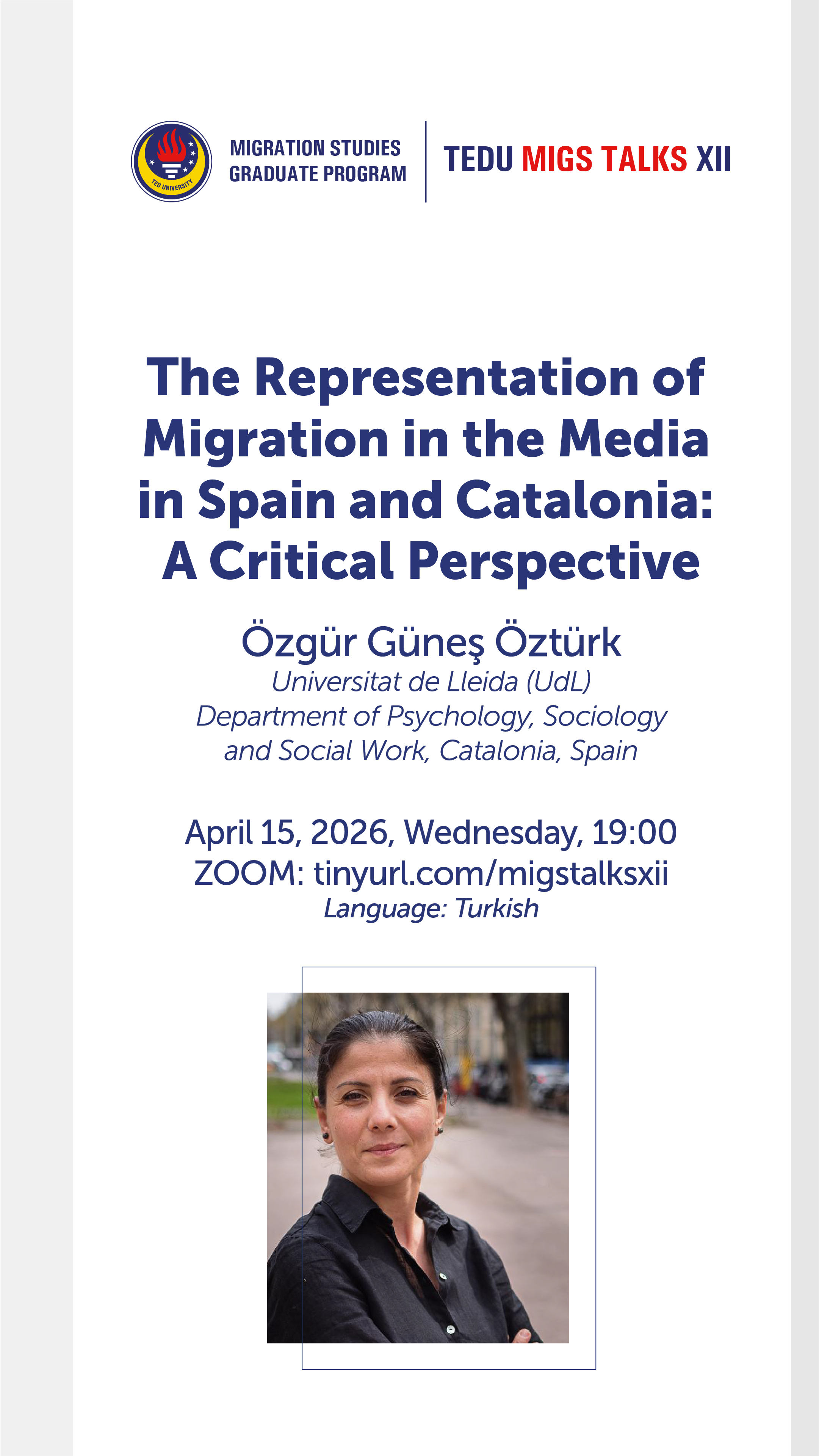 TEDÜ Göç Çalışmaları MIGS TALKS serisinin 12. etkinliği Universitat de Lleida'dan Özgür Güneş Öztürk'ün kayılımıyla 15 Nisan 2026 tarihinde 19.00'da online olarak gerçekleştirilecektir. Etkinlikte, "İspanya ve Katalonya’da Göçün Medyada Temsili: Eleştirel Bir Bakış" başlıklı bir sunum yapılacaktır.